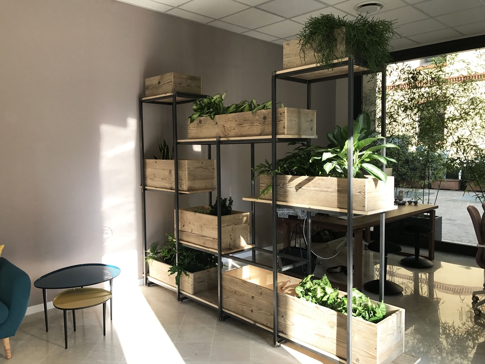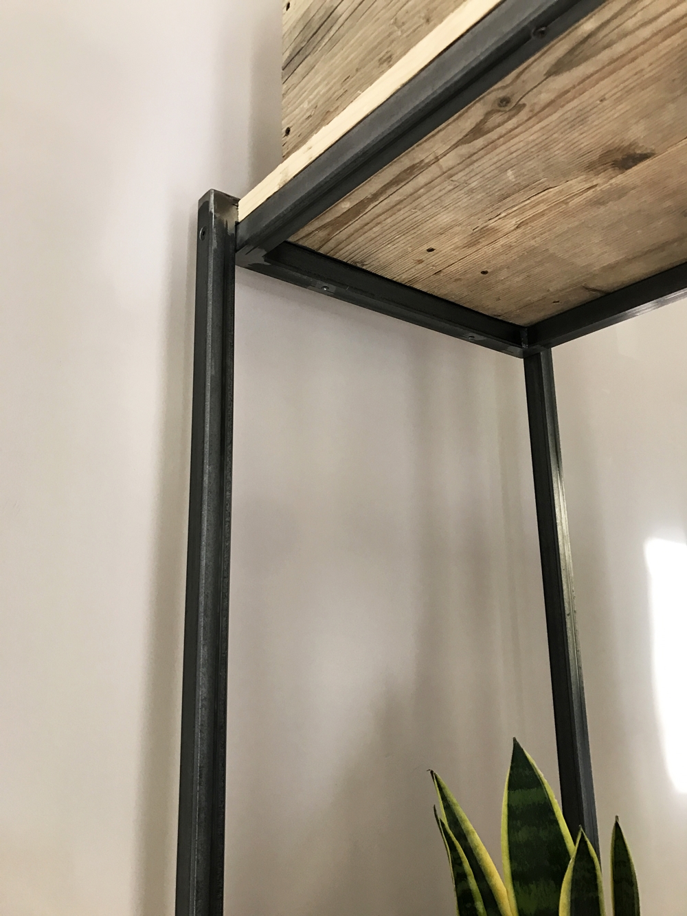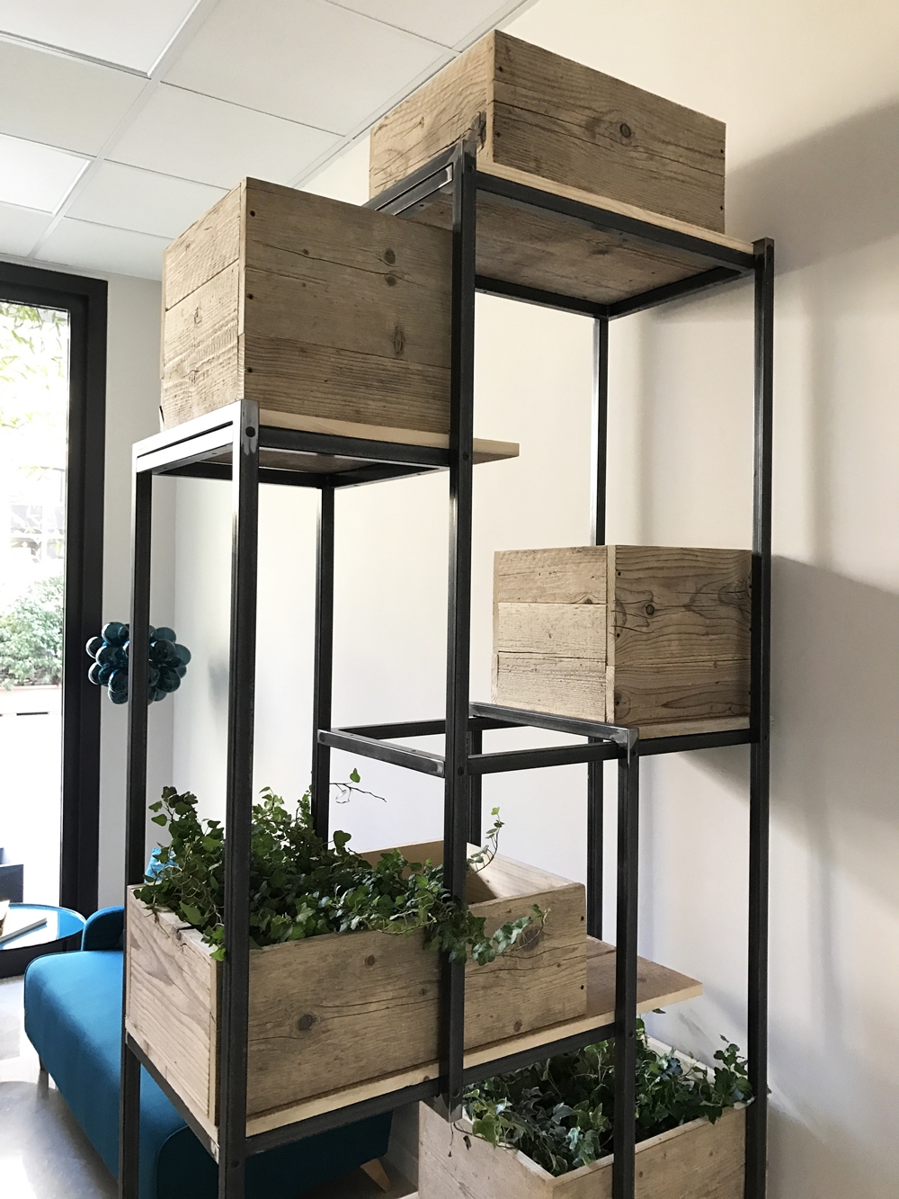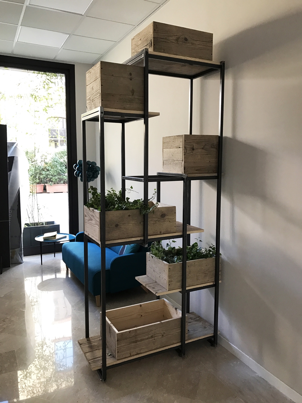 Struttura in ferro grezzo con molature a vista e portavasi in legno ricavato da antiche plance da carpenteria.