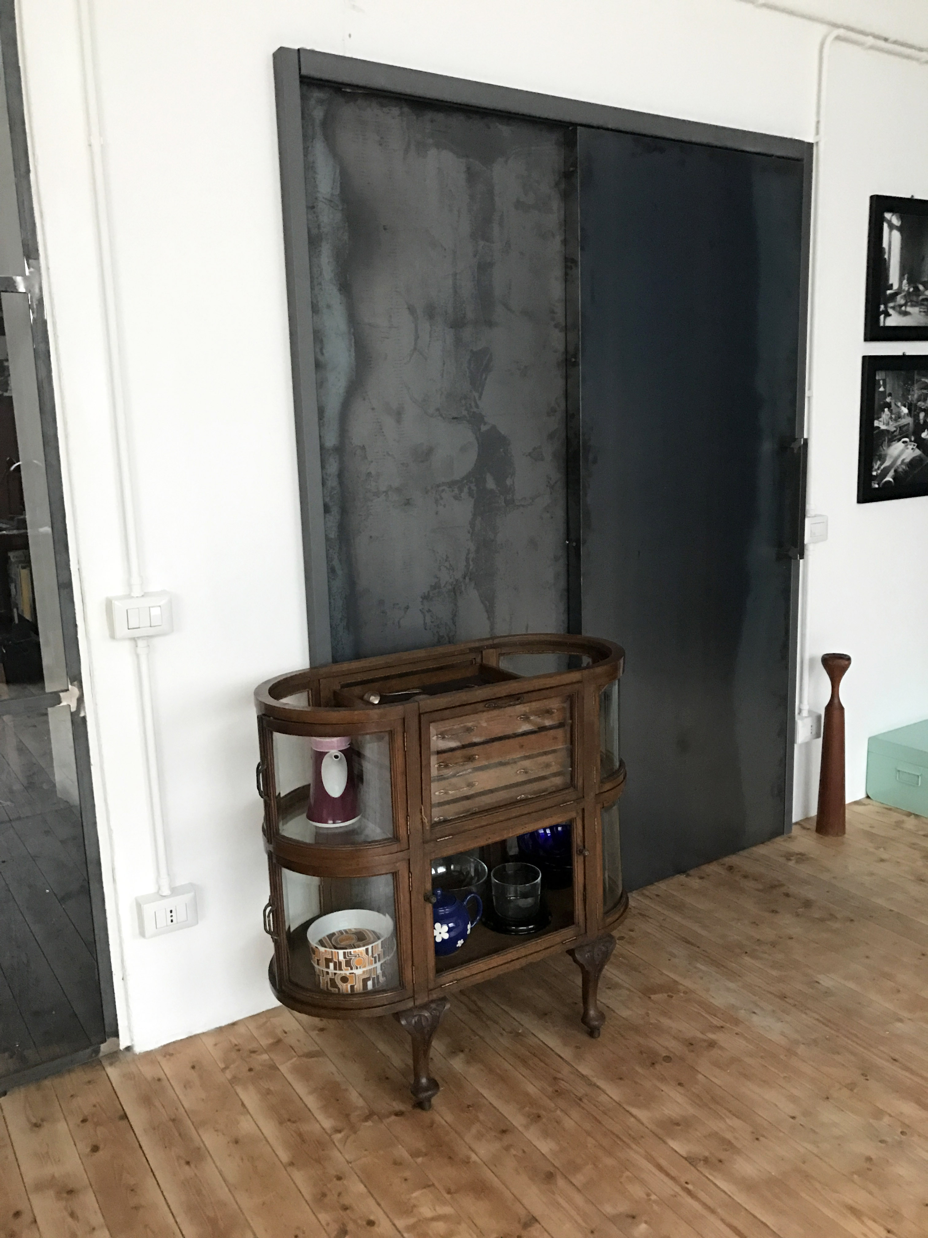 Particolare porta scorrevole in stile industriale brutalista. Progettata e realizzata su misura, è costituita da fogli di lamiera di ferro grezzo, verniciato con uno speciale rivestimento antiruggine trasparente.