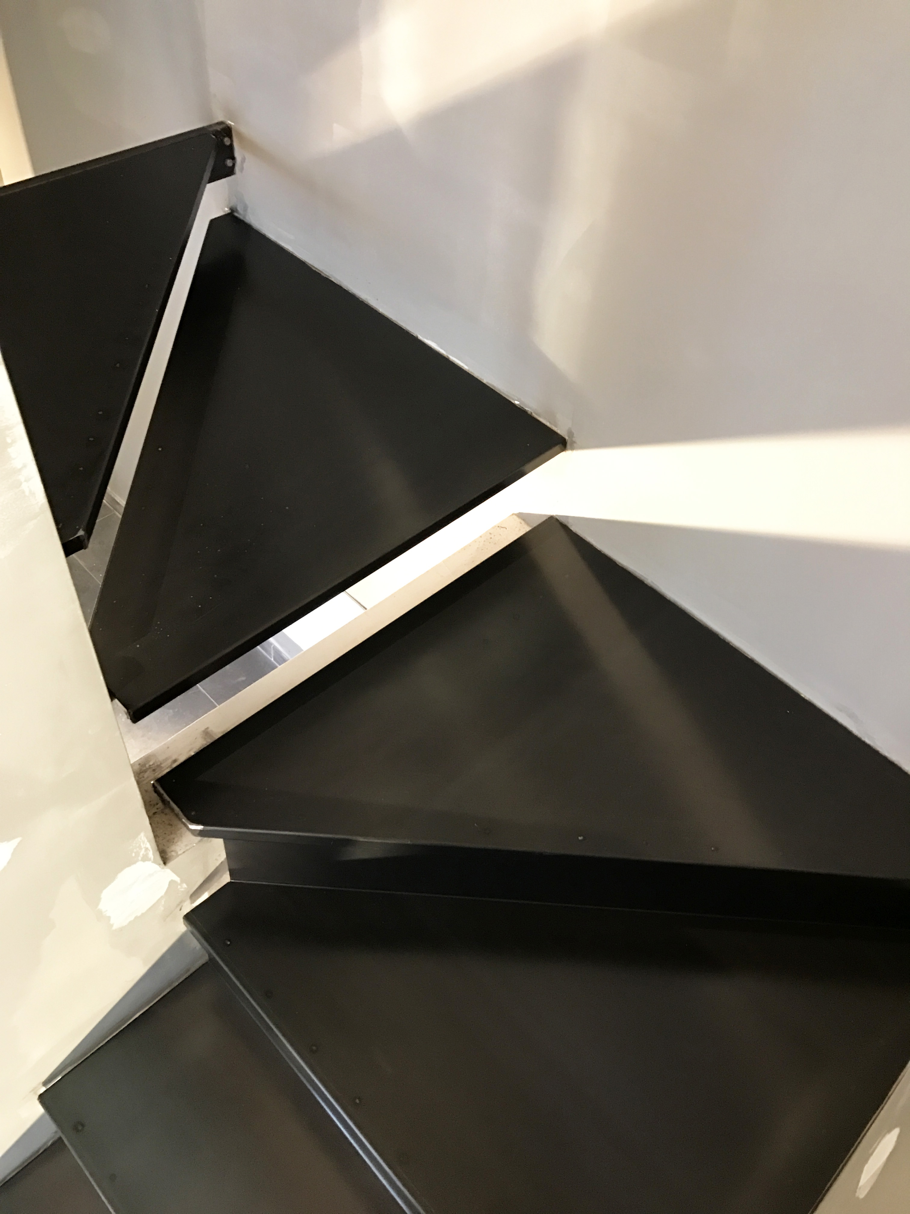 Progettata e realizzata su misura. Struttura portante in tubolare di ferro rettangolare e gradini in lamiera di ferro pressopiegata.